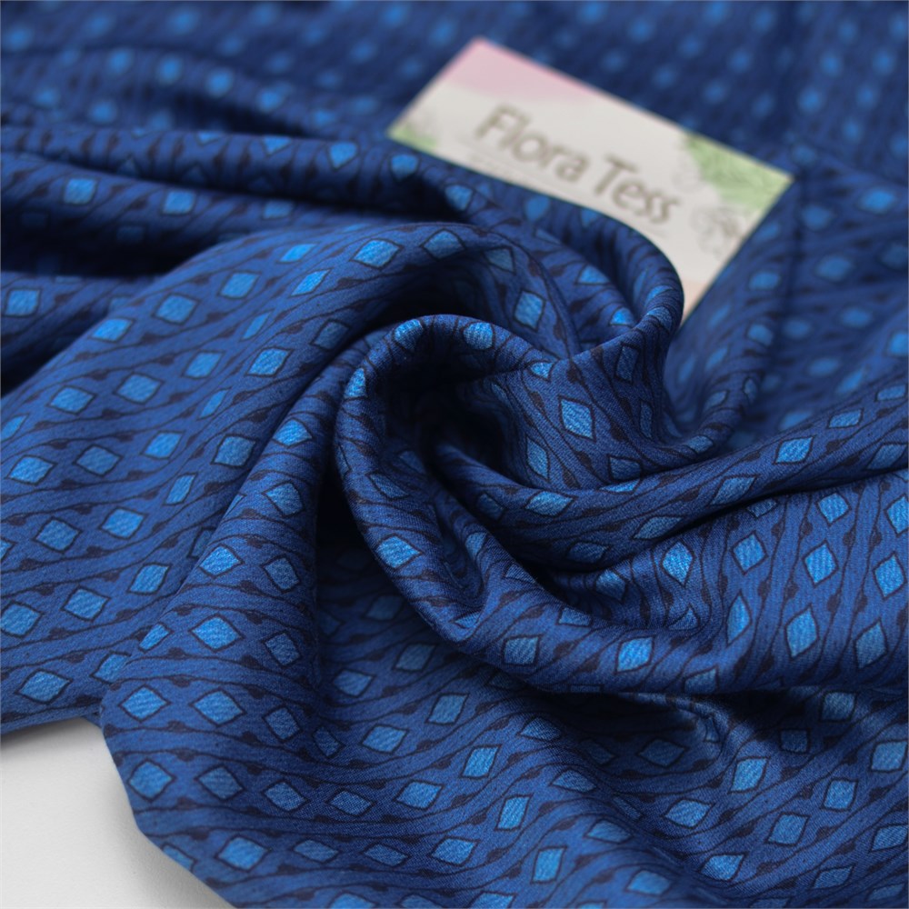 Атласная вискоза с геометричным принтом на синем фоне. Ткань приятная к телу, шелковистая, легкая, не просвечивает. Подойдет для пошива платья, блузы, накидки-кимоно, костюма в пижамном стиле.
