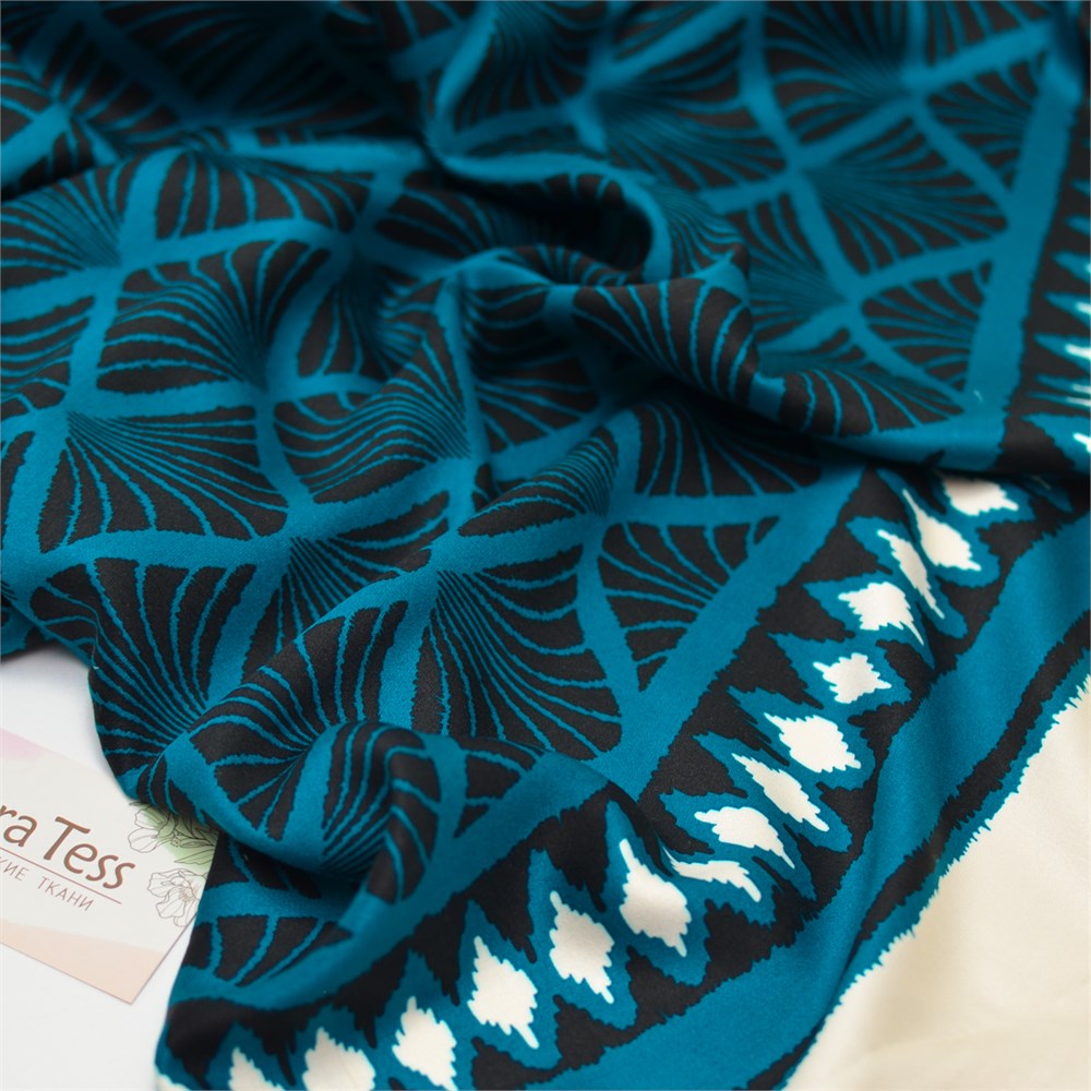 Атласная вискоза с геометричным принтом на сине-зеленом фоне. Ткань приятная к телу, шелковистая, легкая, не просвечивает. По обеим кромкам идет бордюрный узор. Подойдет для пошива платья, блузы, накидки-кимоно, костюма в пижамном стиле.