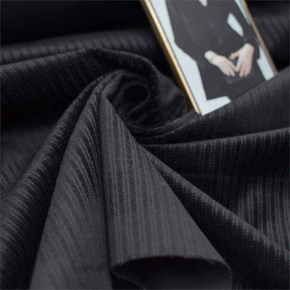 Хлопковый бархат в черном цвете. На поверхности есть небольщой рубчик, напоминающий вельветовую фактуру, идет продольная полоска. Ткань держит форму, сминаемость умеренная, не тянется. Для пошива жакета, юбки, брюк.