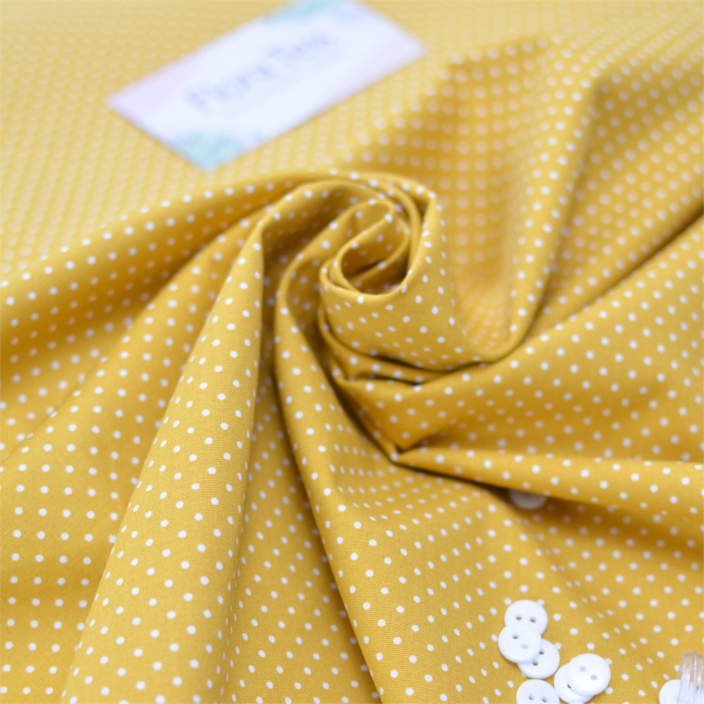 Хлопок в мелкий горошек на горчично-желтом фоне. Ткань легкая, держит форму, не просвечивает, комфортно тянется за счет эластана в составе. Подойдет для пошива рубашки, топа, платья-рубашки, сарафана.