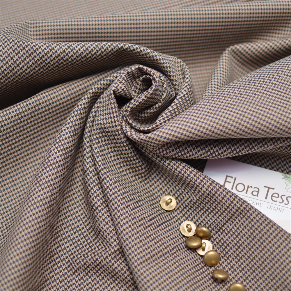 Костюмная ткань с мелкой гусиной лапкой. Красивое сочетание темно-синего и коричневого на бежевом фоне. Ткань держит форму, не мнется, комфортно тянется. Подойдет для пошива костюма, юбки или брюк.