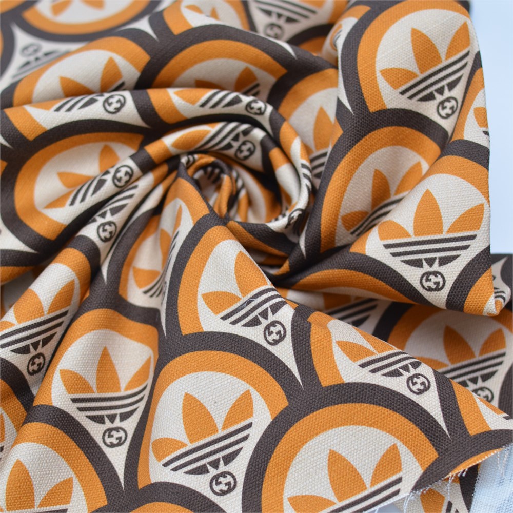 Рогожка их хлопка с брендовым принтом. Ткань отличного качества, держит форму, не просвечивает, чуть тянется. Хорошая плотность. Подойдет для пошива юбки, сумки, жакета.