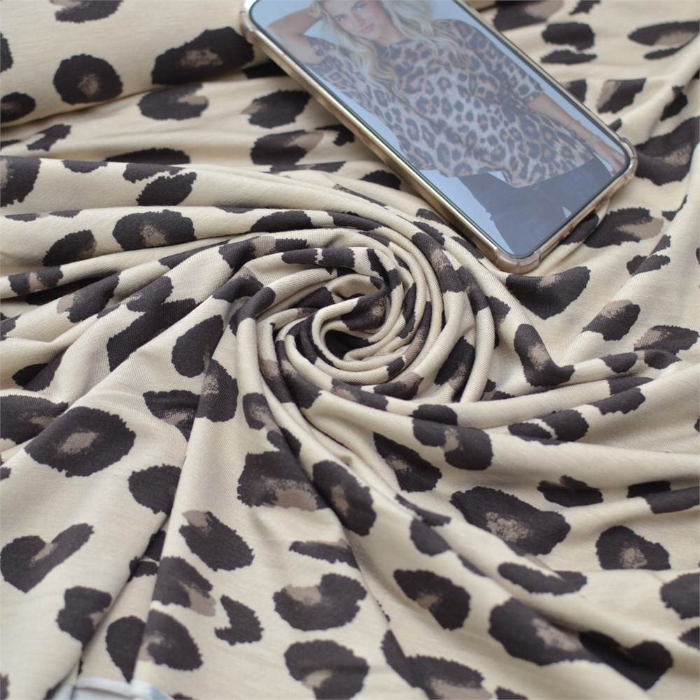 Трикотажное полотно с леопардовыми пятнами на бежевом фоне. Полотно мягкое, пластичное, не просвечивает. В составе вискоза с эластаном.